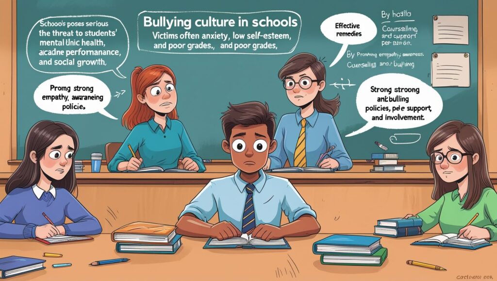 The bullying culture in schools manifests in multiple forms, each with devastating effects. Physical bullying involves direct harm, such as hitting, pushing, or damaging belongings. Verbal bullying is equally destructive, with insults, name-calling, and threats targeting a victim’s self-esteem. Social bullying, often overlooked, isolates students by spreading rumors, excluding them from groups, or damaging friendships. In today’s digital age, cyberbullying has become a major concern. It includes online harassment through social media, messaging apps, or anonymous platforms, making victims feel unsafe even at home. Each type of bullying leaves long-lasting consequences, with emotional and psychological scars often deeper than physical ones. Understanding these categories allows schools to design targeted remedies. By acknowledging the complexity of bullying types, educators and parents can build comprehensive strategies to protect students and foster supportive learning environments where every child feels valued and secure.