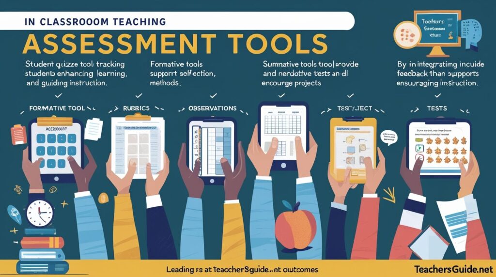 In conclusion, assessment tools in classroom teaching are not optional. They are essential. They guide teaching. They inform learning. They help teachers see what works. Also, they help students grow. When used well, they increase understanding. They build confidence. They promote self-reflection. They support differentiation. They produce evidence for improvement. Formative and summative tools together bring balance. Digital tools add speed and data. Rubrics, peer/self-assessment, observation, feedback—each plays a role. Challenges remain, but they are surmountable. With proper training, planning, and support, these tools transform classrooms. Ultimately, high-quality assessment tools lead to better learning outcomes. Every teacher who embraces good assessment tools helps students not only know but understand deeply. For more articles and tools, you can check TeachersGuide.net.